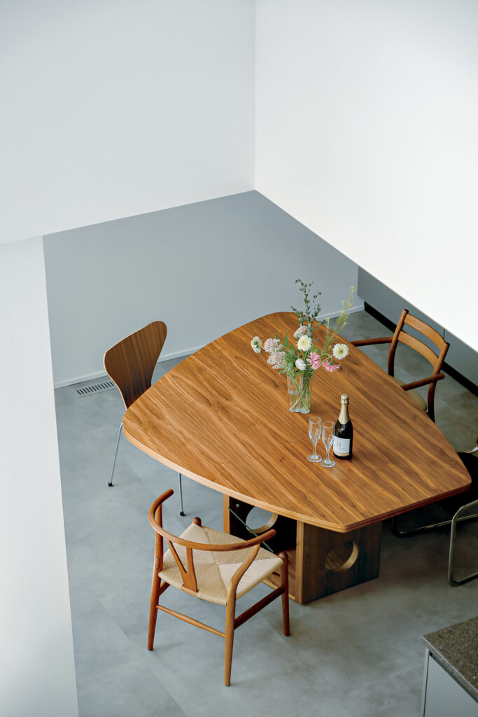 テクタ社の名作ダイニングテーブル「M21」は台形のような有機的なデザインで、座る人数を限定しない。シンプルな空間の主役となりうる存在感がある。