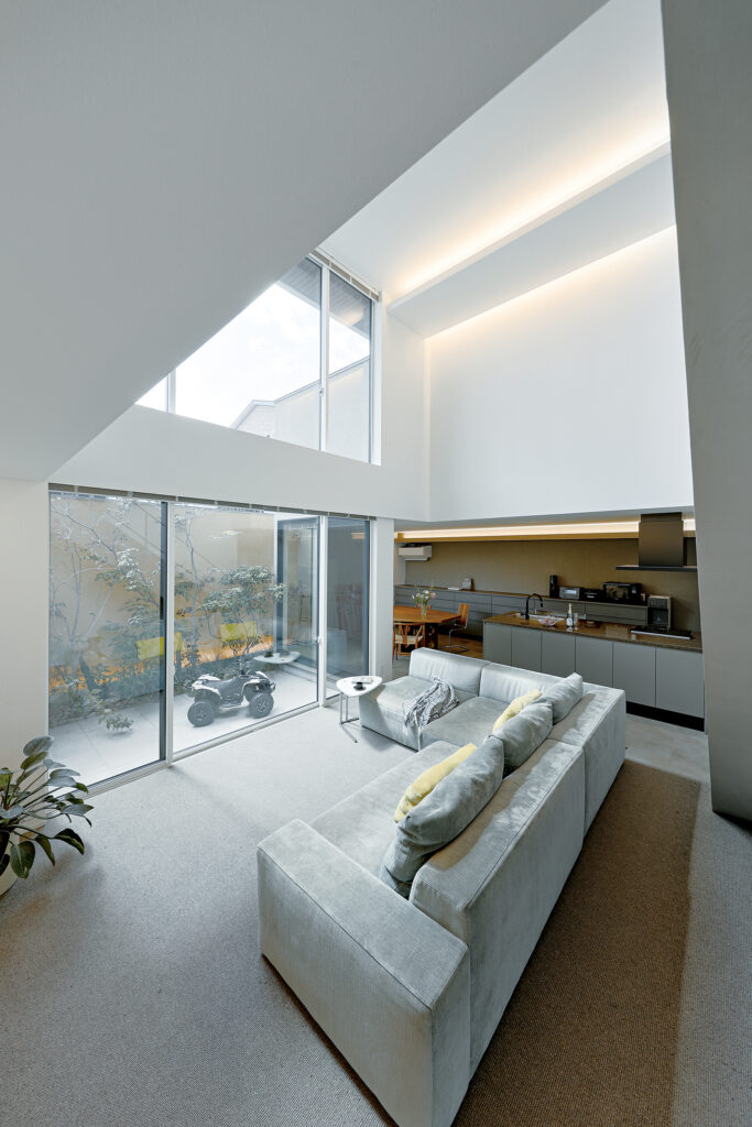 5.5mある吹き抜けに面した大開口から空を仰ぐことができて、屋外のテラスとシームレスにつながるリビング。天井に仕込んだライン状の間接照明がスタイリッシュ。