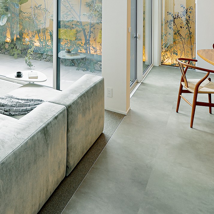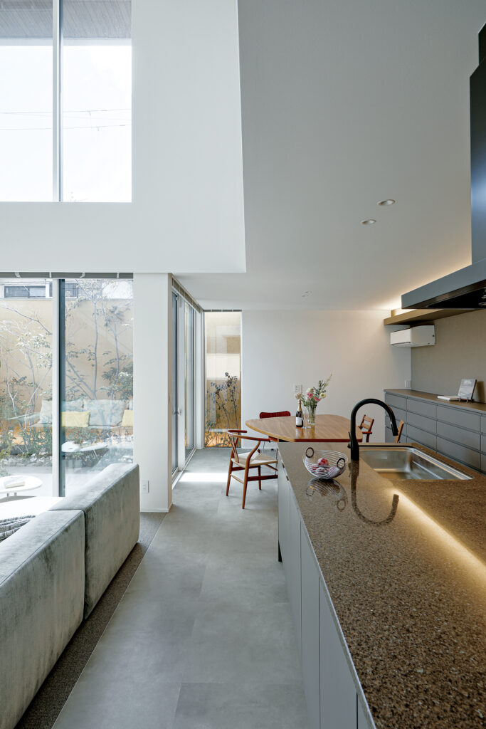 リビングに設けた上下の開口に加え、ダイニング側やスリット窓からも光を取り込み、LDKを明るくキープ。窓越しにテラスの植栽が視界に入り、広がりが感じられる。