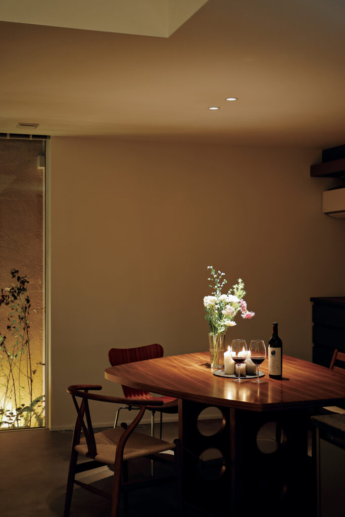 夜になると、ダウンライトの光がダイニングテーブルを照らし出し、ドラマチックな雰囲気に。テラスのグリーンもライトアップされ、家全体が非日常的な空間となる。