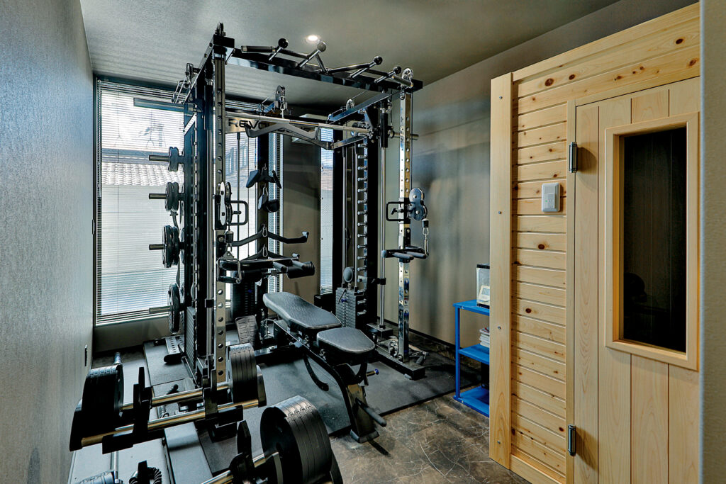 本格的なサウナを設置した2階のプライベートジムはKさんのお気に入りの場所。奥にあるルーフバルコニーに出て、外気浴で整うことも。