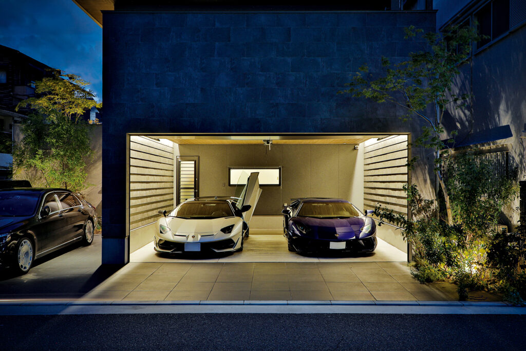 ビルトインガレージは愛車のランボルギーニのアーティスティックな曲線が際立つ照明計画に。ガレージからも玄関へとアクセスできる裏動線を設けた。