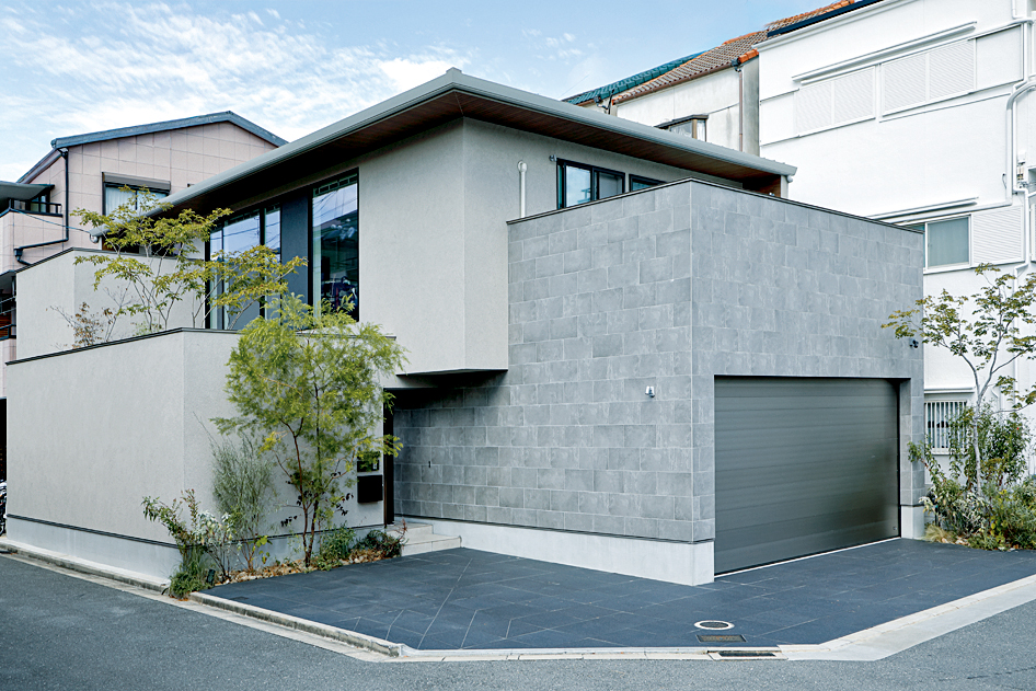 南東角地のため日射取得にも恵まれ、パッシブデザインに最適なロケーション。立体感をもたせたファサードにし、壁面にタイルを使用してモダンなガレージハウスに仕上げた。