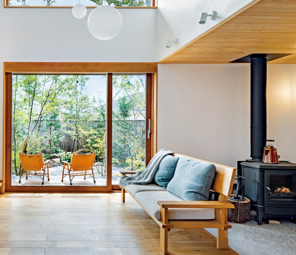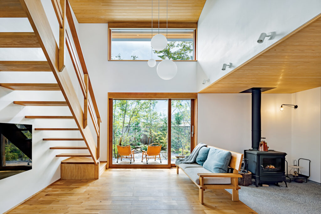 耐震性の高い家を希望した施主は、設計者と対話を重ねて構造・温熱・空調のバランスを追求。真南に向けて深い軒を出して夏は日差しを調節、冬は薪ストーブで家全体を暖める温熱環境設計を実現した。1階にはLDKと土間スペース、主寝室を配し、2階に子どものスタディスペースと個室を配置。上下階は約5mの吹き抜けでつながるひと続きの大空間として、家族が同じ空間にいながらそれぞれの居場所を持てるように。室内は無垢材のオークの床や漆喰など自然素材で統一、庭は石畳や森林のようなグリーンで整え、「季節や時間で気持ちいい場所が変化する」とKさん。耐震性への信頼と心地よさへの感性が調和した、優しく包容力ある家が完成した。