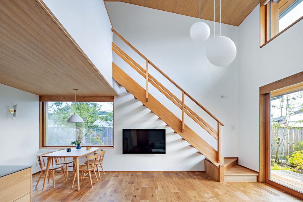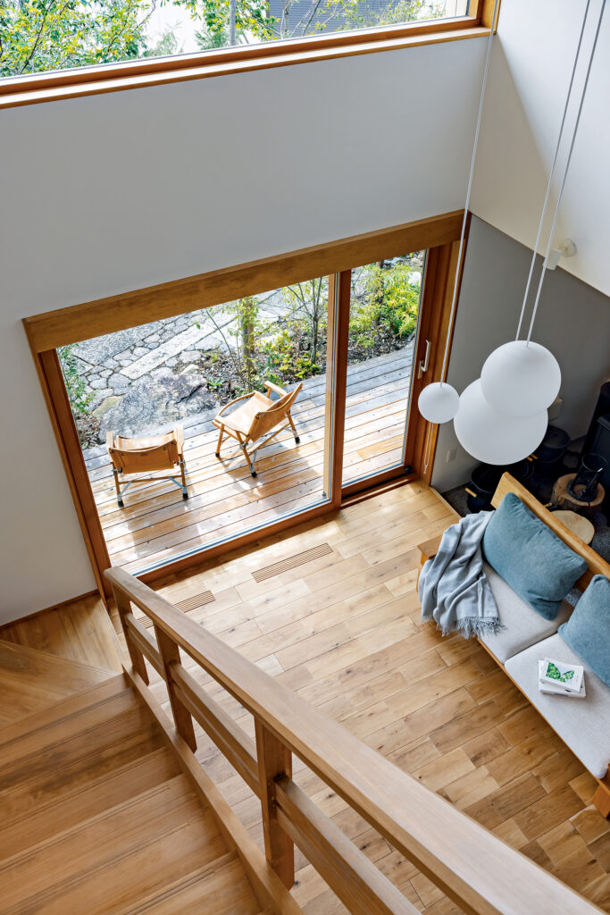 階段からオークの床のリビングを見下ろす。吹き抜けの高さは約5mある。夏場には深い軒が室内に入る日差しの量を調整することで、LDKは程よい明るさになる。