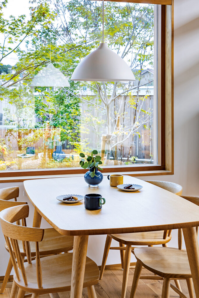 家族が集う場所であるダイニングにも大きな窓を設けた。目隠しのために窓の外に植えたグリーンが、家族を癒やす景色としての役割も担う。