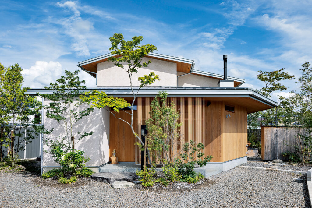 そとん壁(天然素材の「シラス」を原料とする自然素材の壁)と木材のコントラストが印象的な外観。深い軒が車寄せの役割も果たす。
