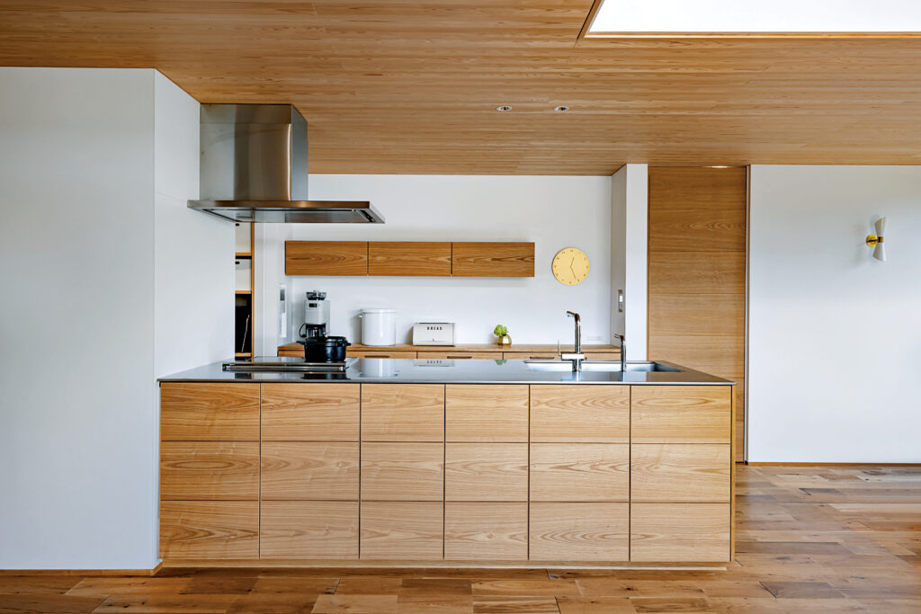 TOTOのシステムキッチンを一部カスタマイズして造作。棚や扉をすべて木製でそろえた端正なキッチンが、LDKに流れる統一感の陰の立役者といえる。